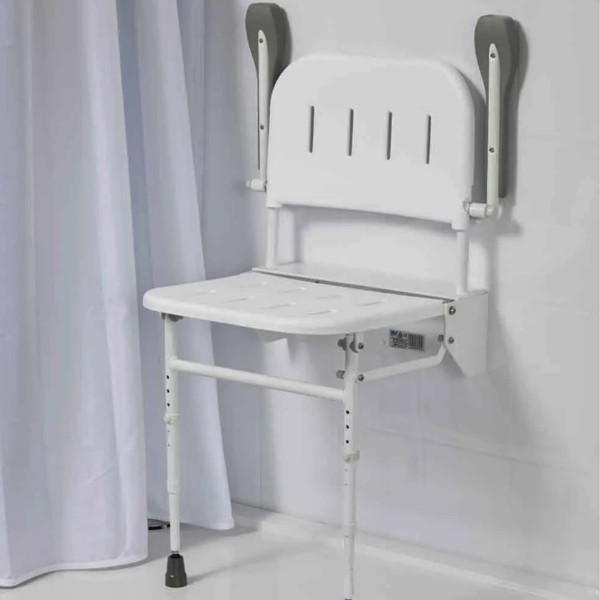 Este asiento es la mejor opción cuando se quiere tener un asiento siempre disponible pero que se pueda abatir fácilmente dejando la ducha libre. Las patas de altura regulable permiten instalarlo a la altura idónea del usuario, y dan mayor seguridad ya que soportan la mayor parte del peso. Incorpora reposabrazos para mayor soporte al sentarse o levantarse.