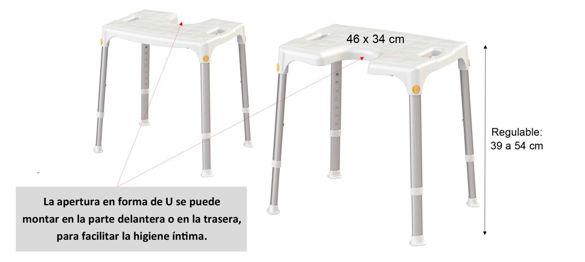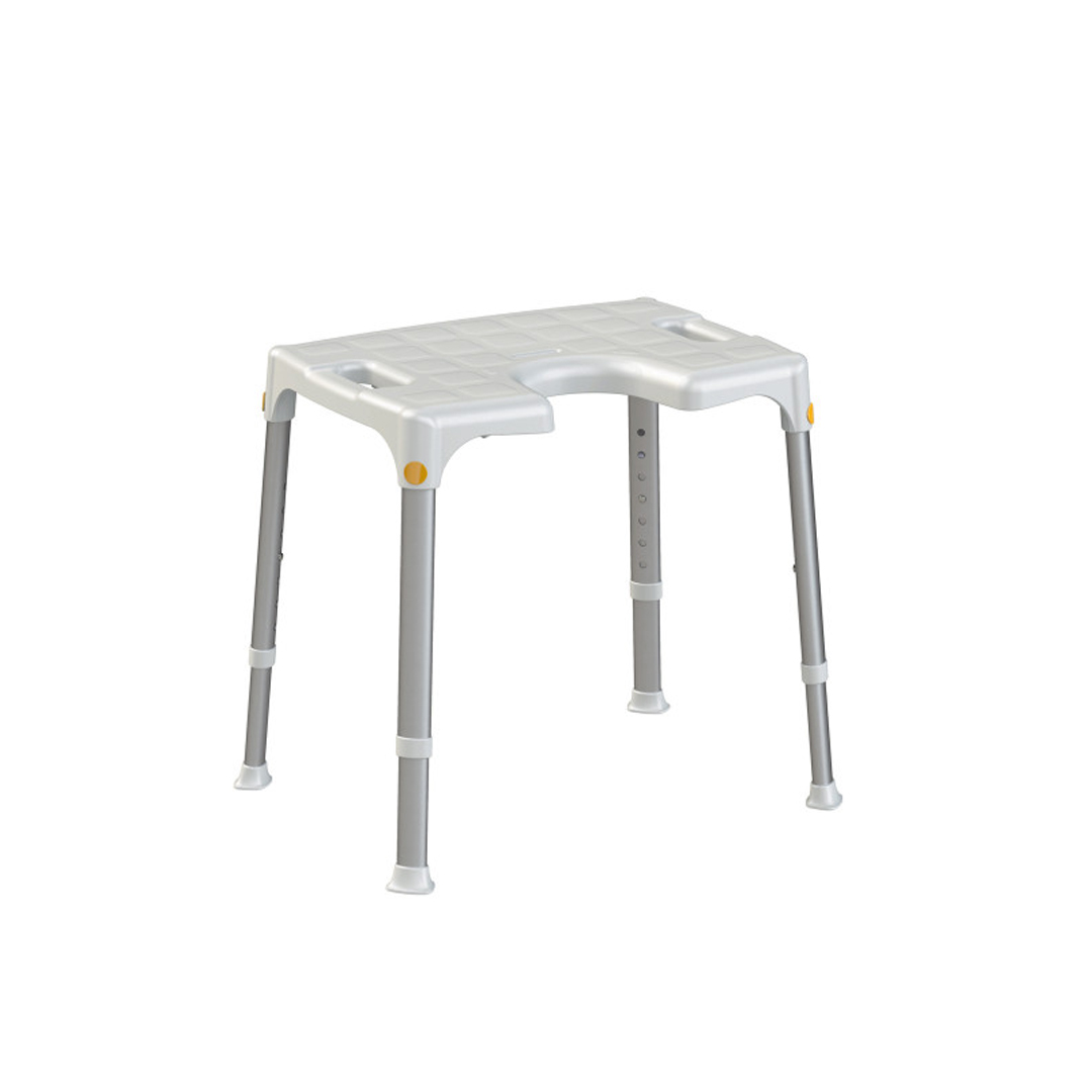Banqueta con asiento en forma de «U» la cual facilita la higiene íntima. Está especialmente diseñada para ser utilizado en el baño. Sus patas extensibles permiten graduar la altura del asiento y sus conteras la dotan de gran estabilidad.