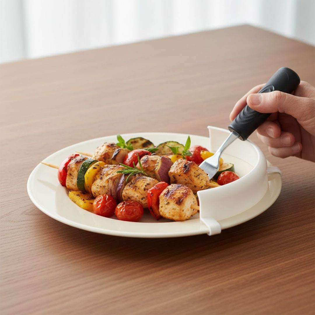 Este borde cuenta con un diseño de borde rígido elevado (3,2 cm de altura) que actúa como una pared de empuje. Permite al usuario deslizar los alimentos contra él, facilitando que la comida se cargue en el tenedor o cuchara sin que se derrame fuera del plato.