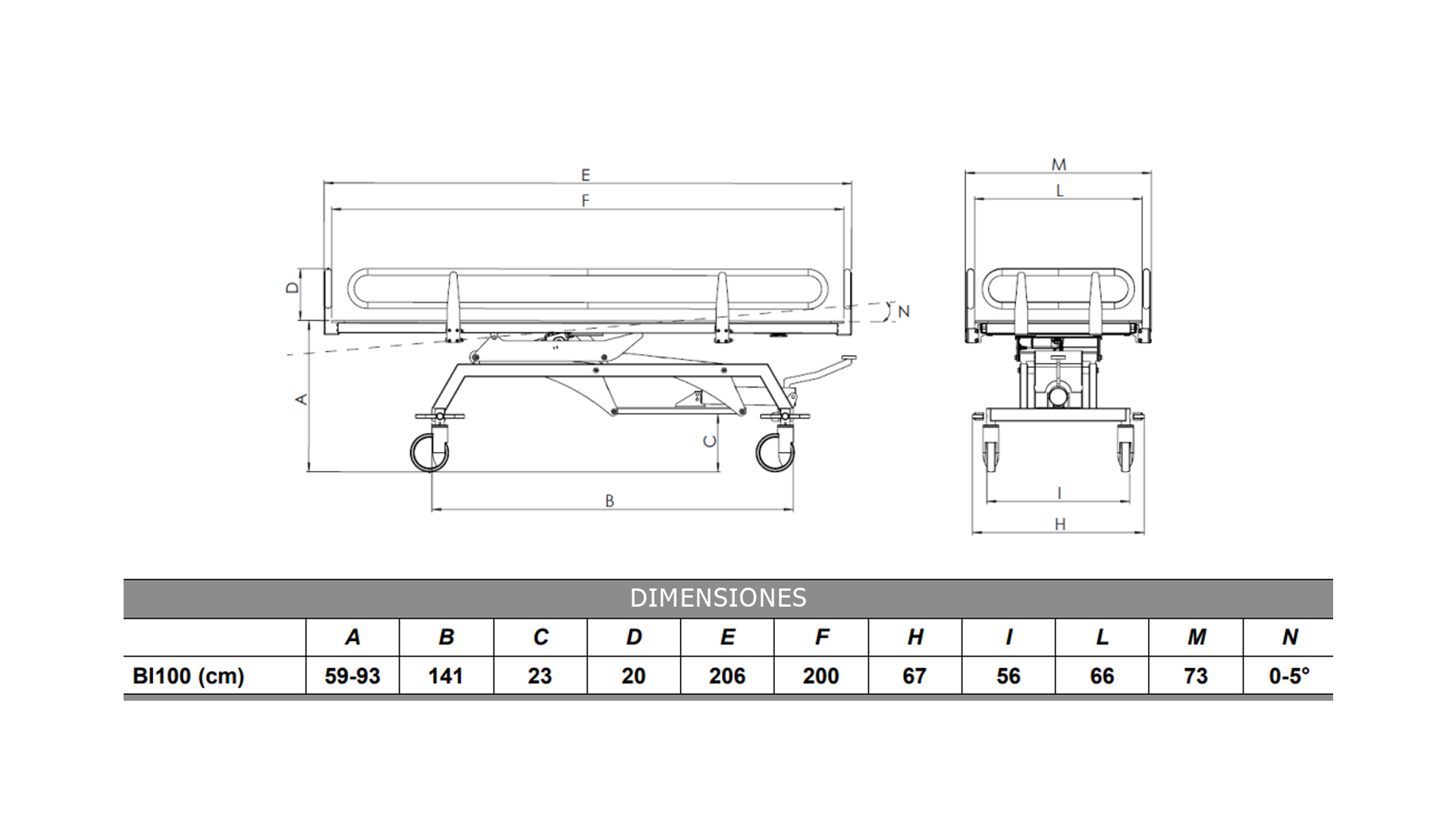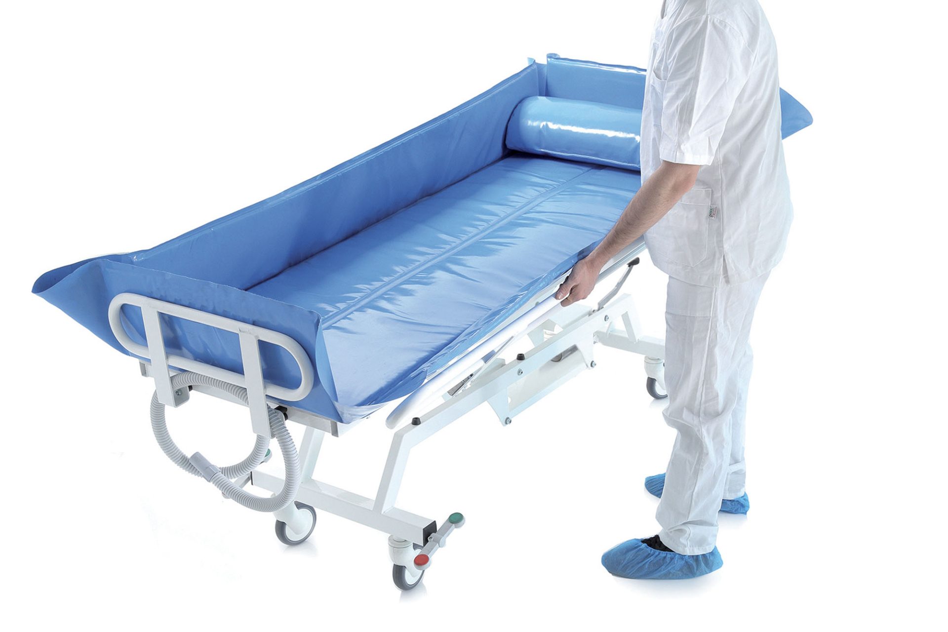 Carro de ducha para lavado y traslado de pacientes, regulable hidráulicamente de 59 a 93 cm, con superficie de lavado basculante con resorte de gas hasta 5° para un correcto drenaje durante y después del uso. Estructura en acero pintado en polvo, con tratamiento antioxidante de origen automotriz para garantizar confiabilidad y durabilidad en el tiempo. Lámina acolchada de PVC reforzado con poliéster, libre de ftalatos, higienizable. Las ruedas de alto deslizamiento, Ø 125 mm, están equipadas con un freno de bloqueo total. El ancho limitado de la camilla permite un fácil movimiento sin esfuerzo incluso en espacios reducidos. Equipado con laterales abatibles a 25° y 180° para permitir un fácil posicionamiento del paciente en la camilla directamente desde la cama y viceversa.