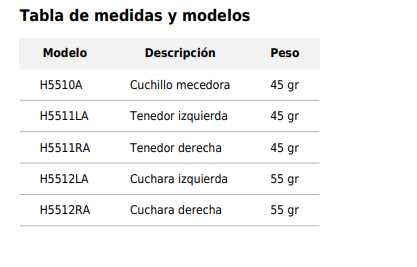 | MODELO | TENEDOR DRCHA, TENEDOR IZQ, CUCHARA DRCHA, CUCHARA IZQ, CUCHILLO, TENEDOR CUCHARA |