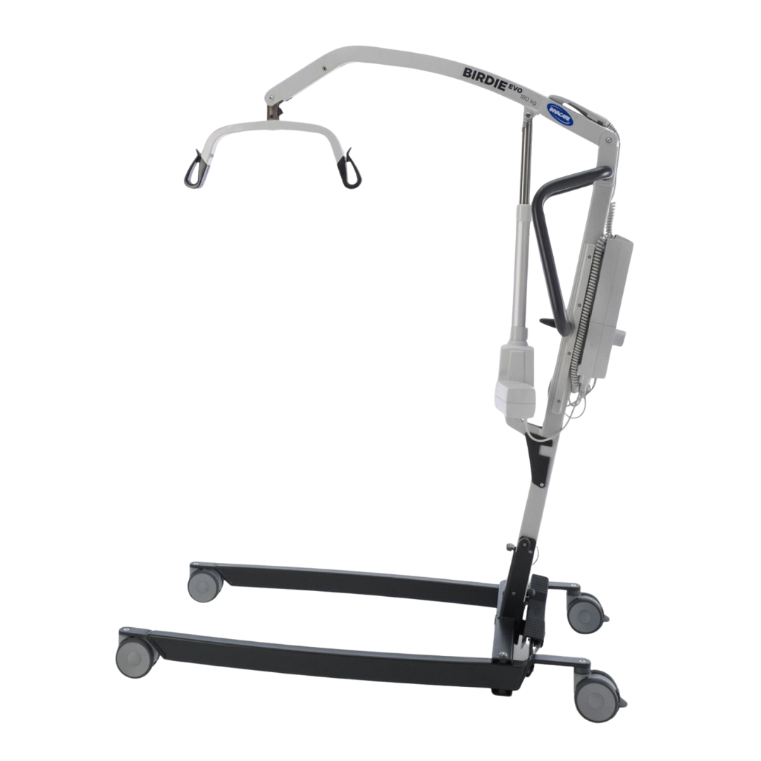 La nueva familia de grúas Birdie Evo ha sido diseñada para ofrecer una amplia gama de beneficios en conjunto con nueva tecnología que aporta la máxima comodidad y seguridad al paciente cuando se realiza una elevación o una transferencia a/desde la cama, silla o incluso a/desde el suelo. La grúa Birdie Evo soporta un peso máximo de usuario de 180 kg y 150 kg en su versión Compact. El rango de elevación de la grúa alcanza una elevación ergonómica que permite rotar fácilmente 360º al paciente.