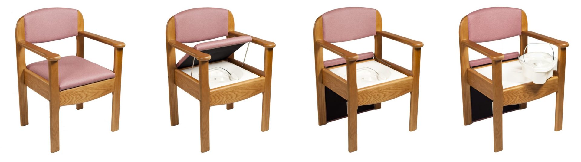 El asiento y el respaldo están acolchados con materiales ignífugos y de alta resistencia, pensados para brindar comodidad y seguridad. Además, estos materiales son fáciles de limpiar, lo que facilita su mantenimiento y asegura una higiene adecuada. Este modelo incluye un mecanismo que permite abatir el asiento hacia la parte trasera de la silla, descubriendo un asiento de plástico y un orinal de 5 litros con tapa y asidera, lo que permite un transporte sencillo. Además, un dispositivo de seguridad impide que la tapa se abra accidentalmente al extraer el orinal, proporcionando mayor tranquilidad.